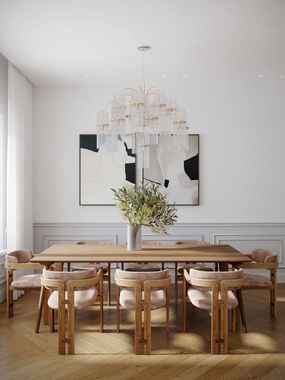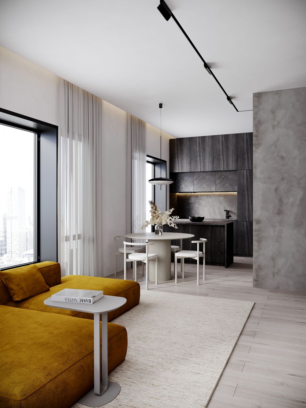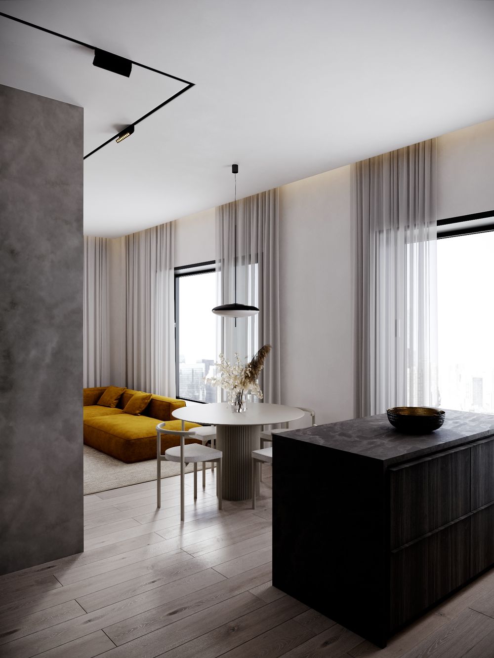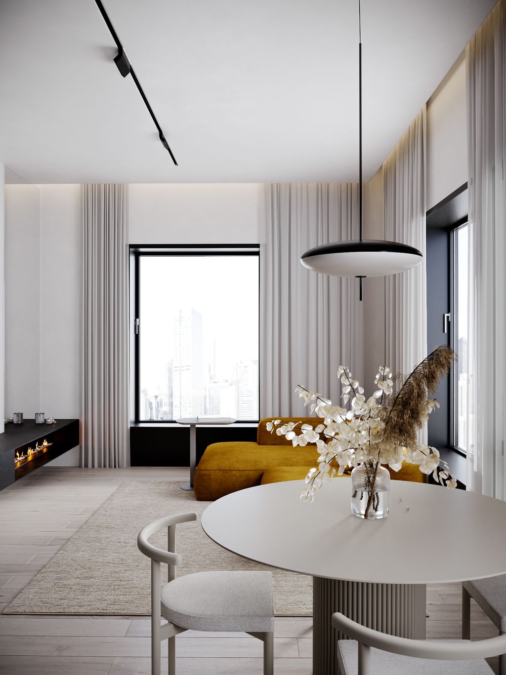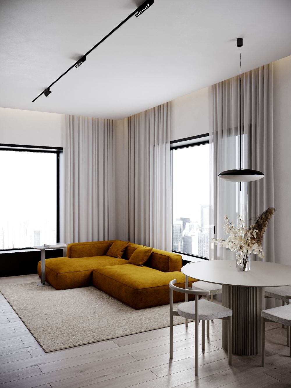 Большие окна — настоящее украшение квартиры. Много естественного света создает ощущение простора в квартире и визуально увеличивает внутреннее пространство. Рядом с окнами можно удобно расположить большой диван, обеденный или кофейный столик для созерцания открывающихся видов на город.