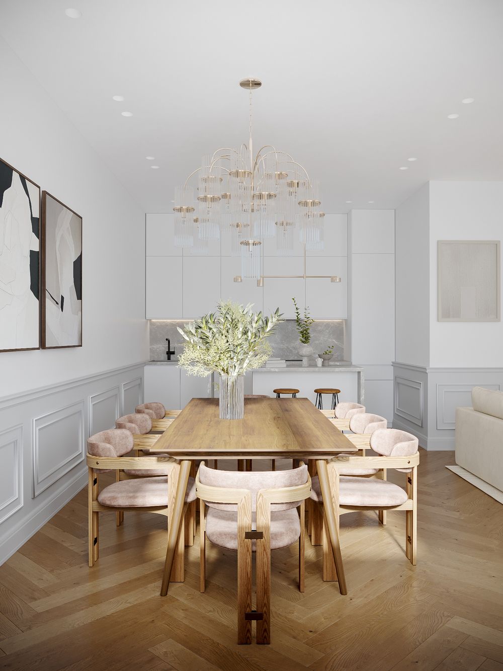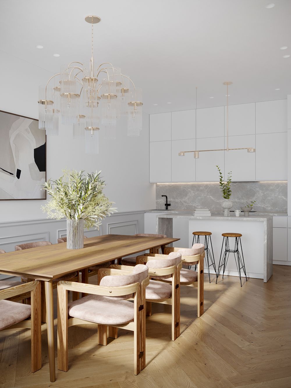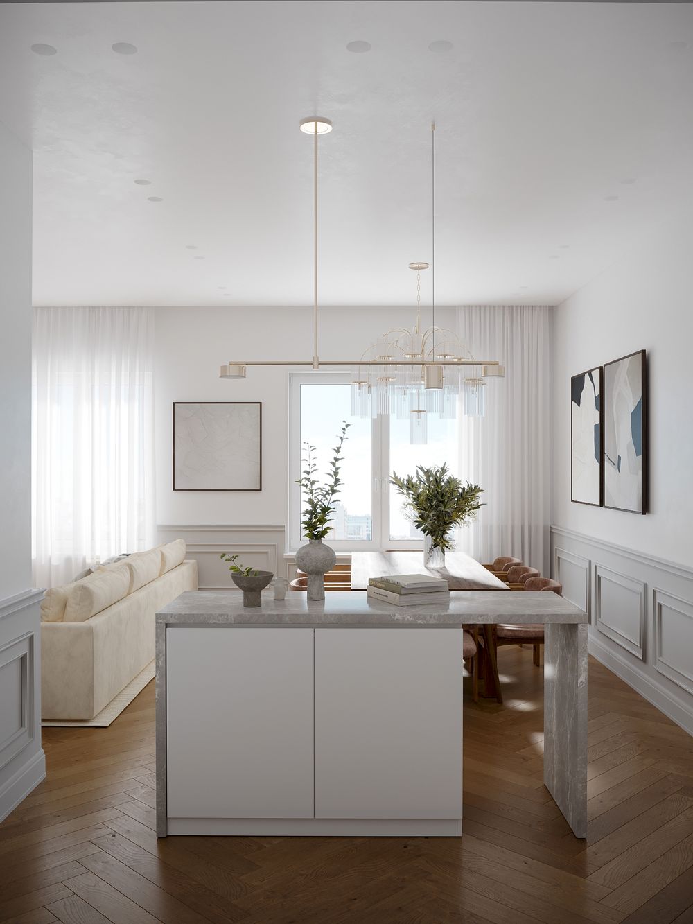 Такой формат удобен семьям, которые любят проводить вечера в компании друзей. А так же для молодых семей, у которых маленькие дети. В то время, пока в рабочей зоне кухни готовится обед, ребенок находится на безопасном расстоянии от плиты и под присмотром в зоне гостиной.