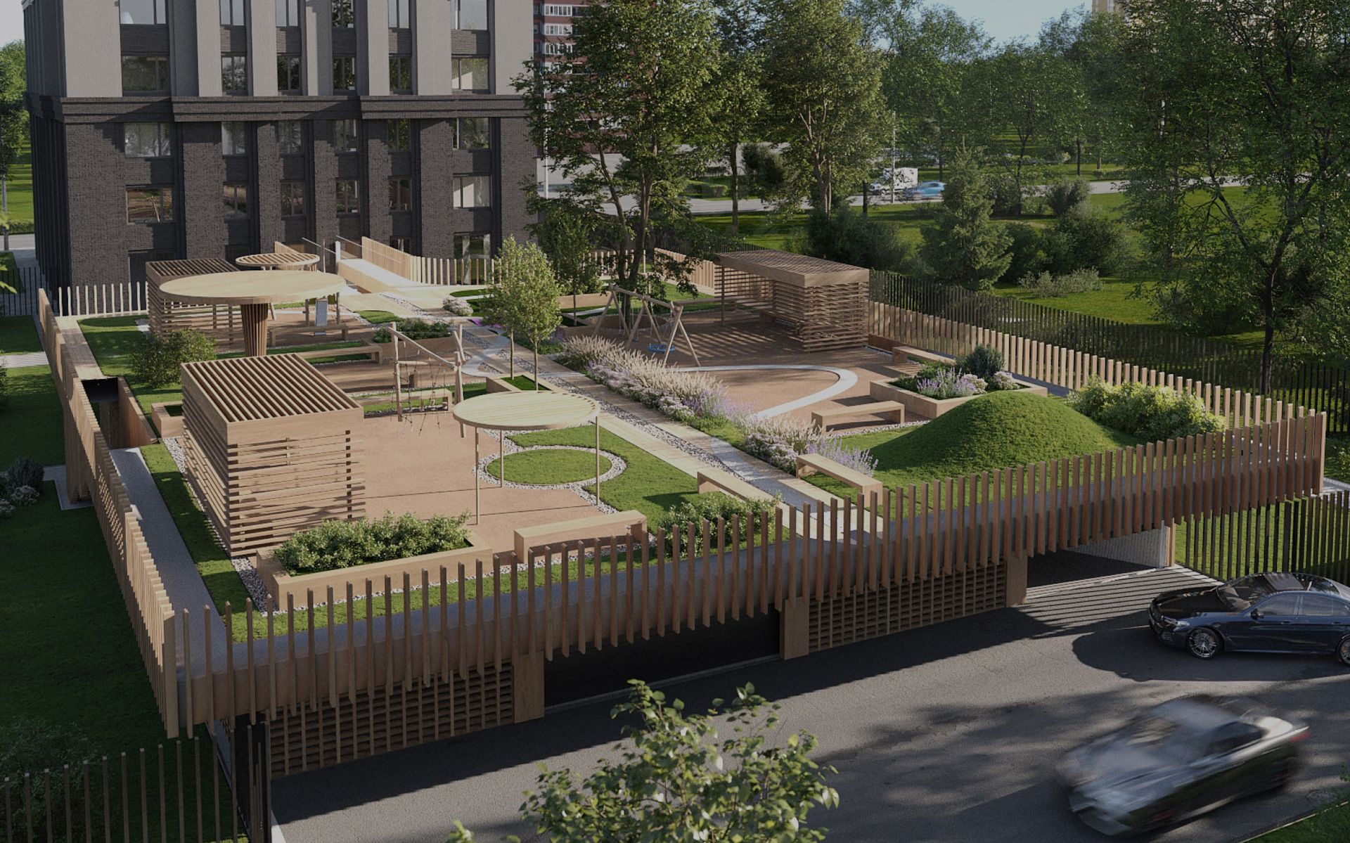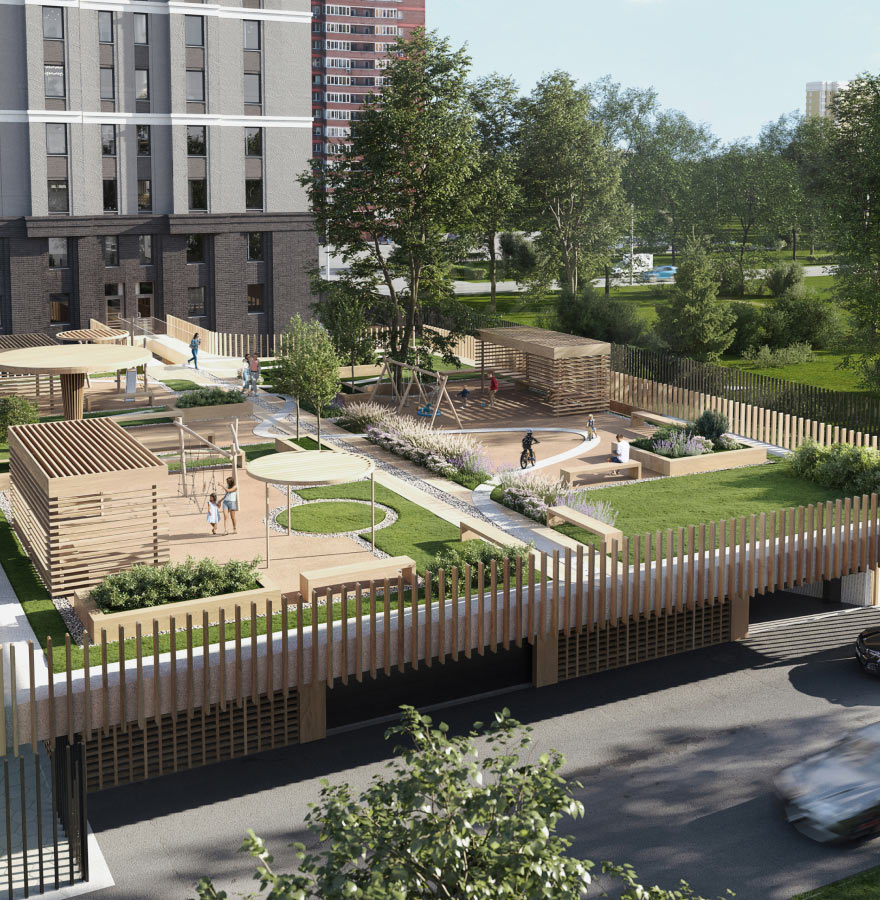 Защищённость — один из главных приоритетов проекта ZOE. Территория жилого дома находится за огражденным периметром, а благоустроенный двор поднят на высоту второго этажа.